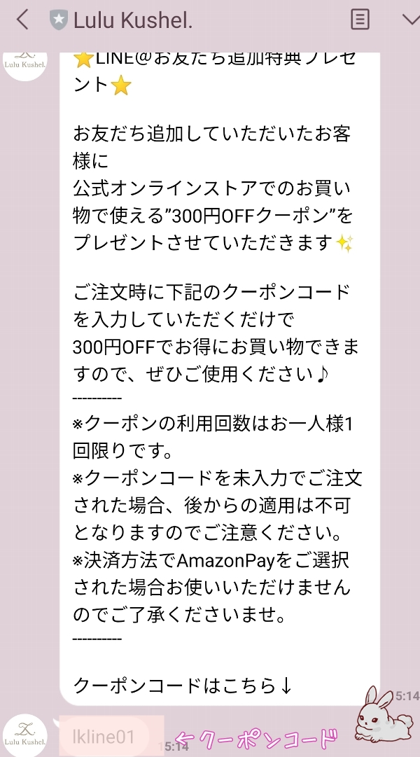 ルルクシェルは、LINEで友達登録すると300円の割引クーポンコードが発効されます◎