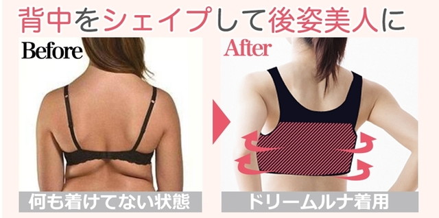 バストアップだけではなく、背中にも効果的にアプローチしてくれます。Tシャツを着る時期になったら、背中の贅肉がコンプレックスで日中も脇高な表面積の多いブラを選んだりしていました。今年はドリームルナのおかげでデザイン重視のお洋服が着れそうです!