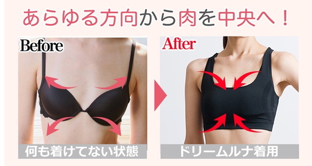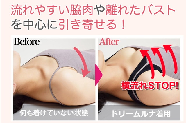 ドリームルナは、アンダーバストに施されている「着圧ライン」が横からも下からも、脂肪を中央に集めて丸みのあるふっくらしたバストを作り上げてくれます。