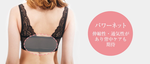 背中のサポート部分には、パワーネットを使用しています。脇や背中のお肉をバストへ誘導し、ボリュームアップと形の補正効果もあります。