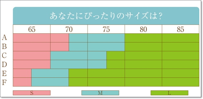 サイズはS・M・Lの3展開で、A~Fカップ対応。アンダーバストは65・70・75・80・85まで対応しています。
